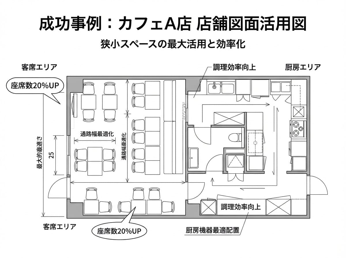 レイアウト図で座席数や通路幅を最適化したことで、狭い面積ながら収容人数を20%増やすことに成功。