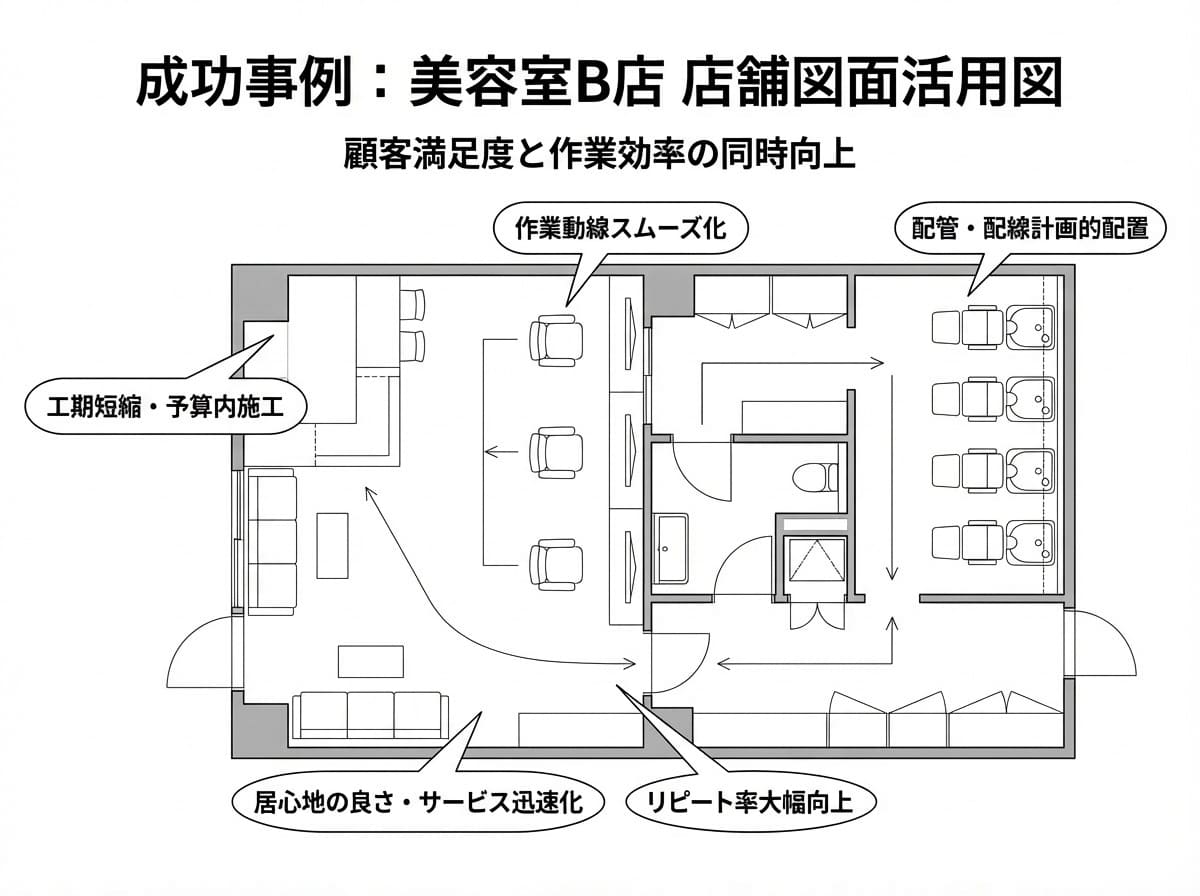 美容室B店では、店舗図面を活用して顧客満足度と作業効率を同時に高める設計を実現しました。