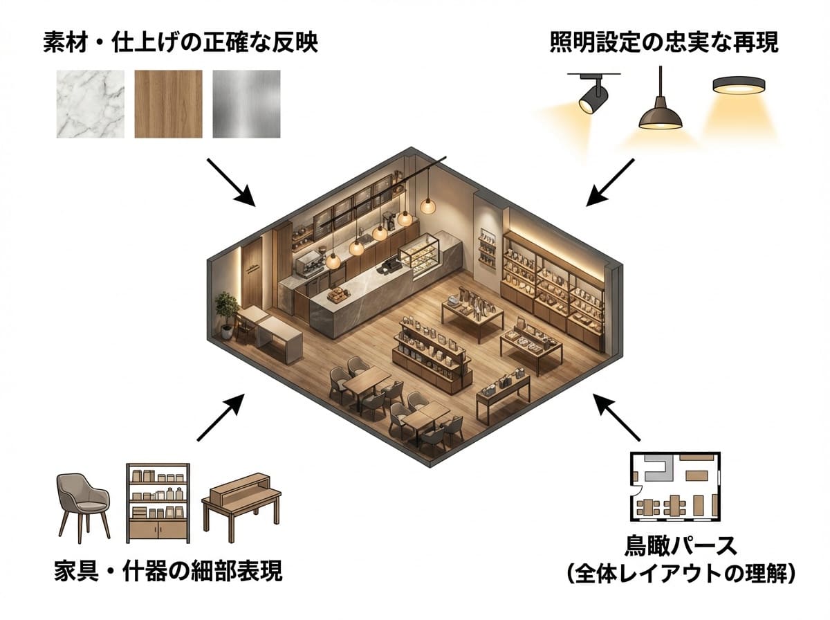 言葉や二次元の図面だけではなかなか伝えきれない店舗内装の質感、配色、空間的な広がりや家具の配置などを、立体的なビジュアルで直感的に示せるためです。