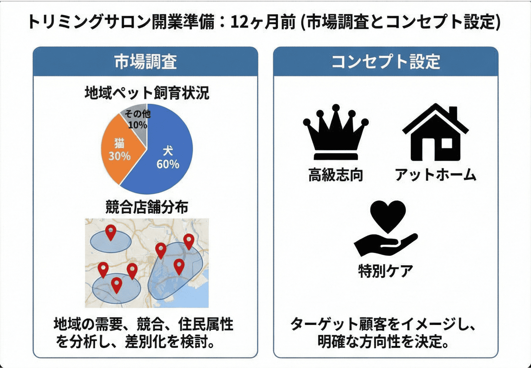特にペットの種類や飼い主のニーズを分析し、サービス内容や料金設定などを考える上での土台を作ります。
