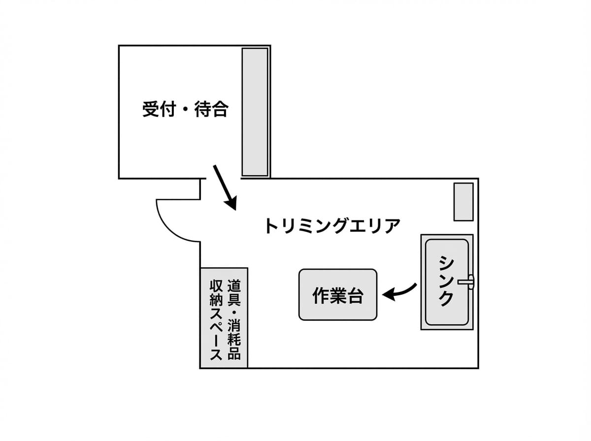 具体的には、受付・待合スペースとトリミングエリアの距離を短くし、施術中のペットの移動距離を最小限に抑えることで、ペットへの負担も軽減できます。
