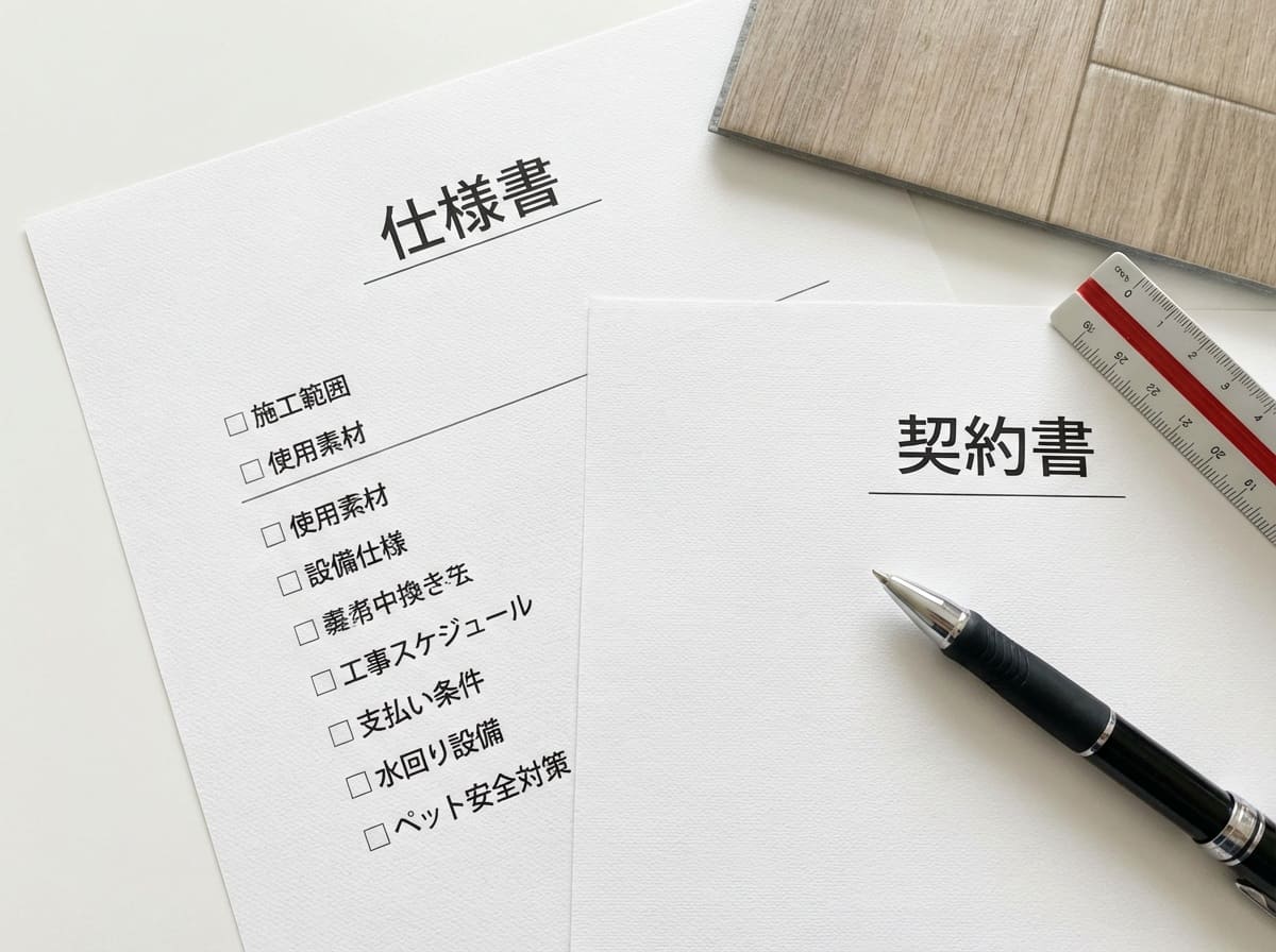 仕様書には、施工範囲や使用する素材、設備の仕様、工事スケジュール、支払い条件、追加工事や変更が生じた際の対応方法まで詳しく記載します。