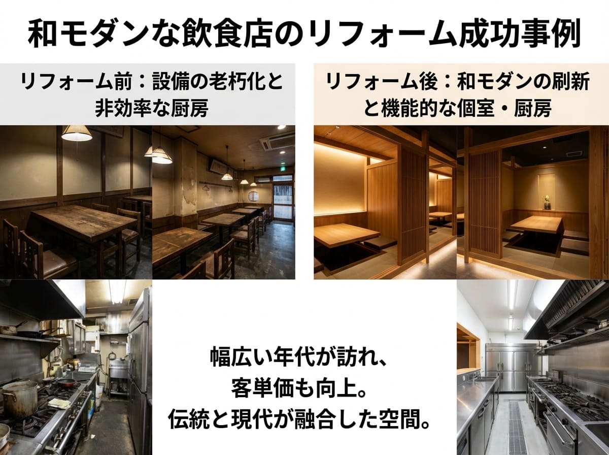 飲食店のリフォーム成功事例としては、老舗の和食店が和モダンなスタイルに刷新したケースがあります。