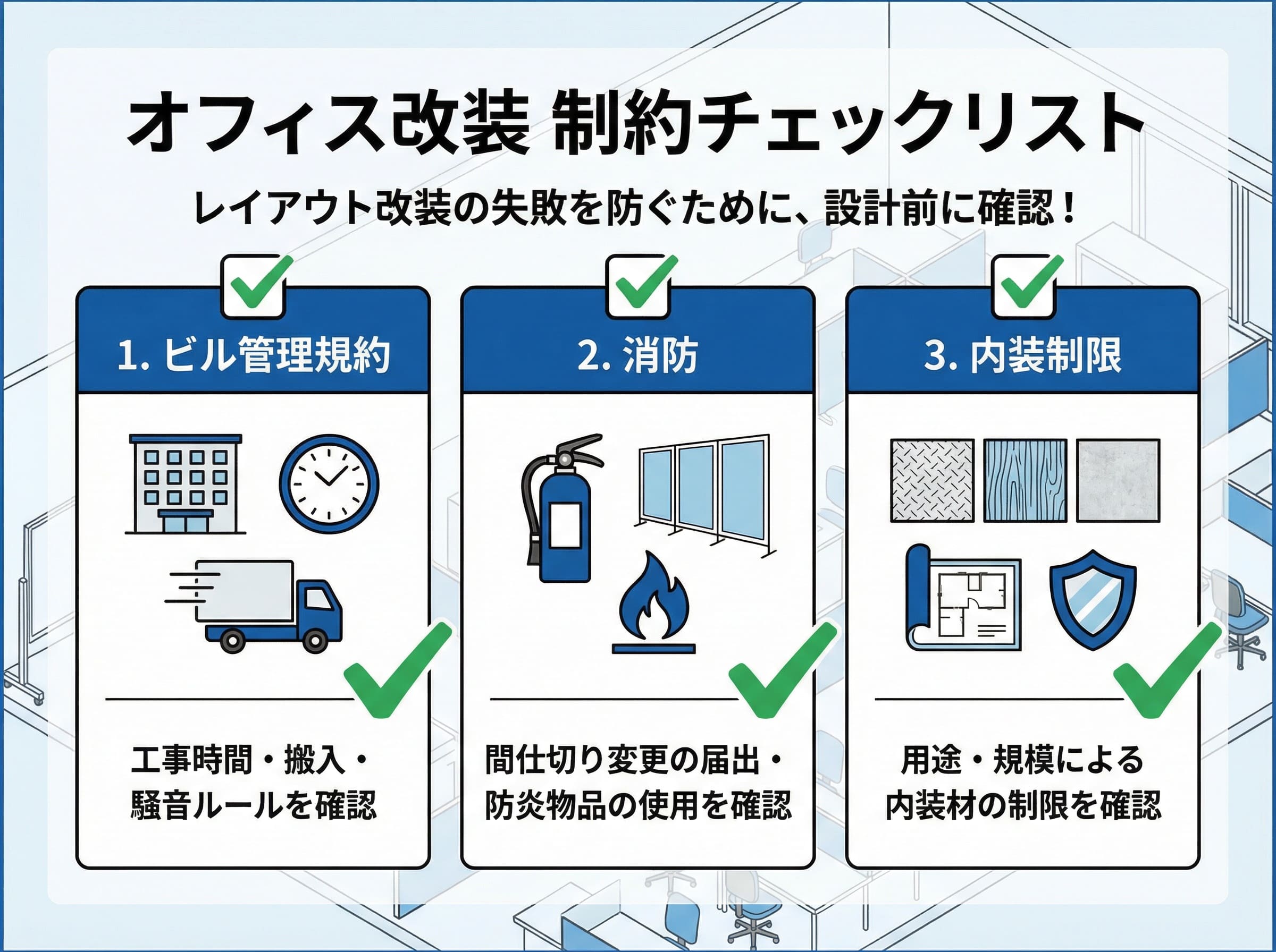 「レイアウトだけ変えるから関係ない」ではなく、間仕切り・カーペット・ブラインド等が絡むなら早めに確認、が安全です。