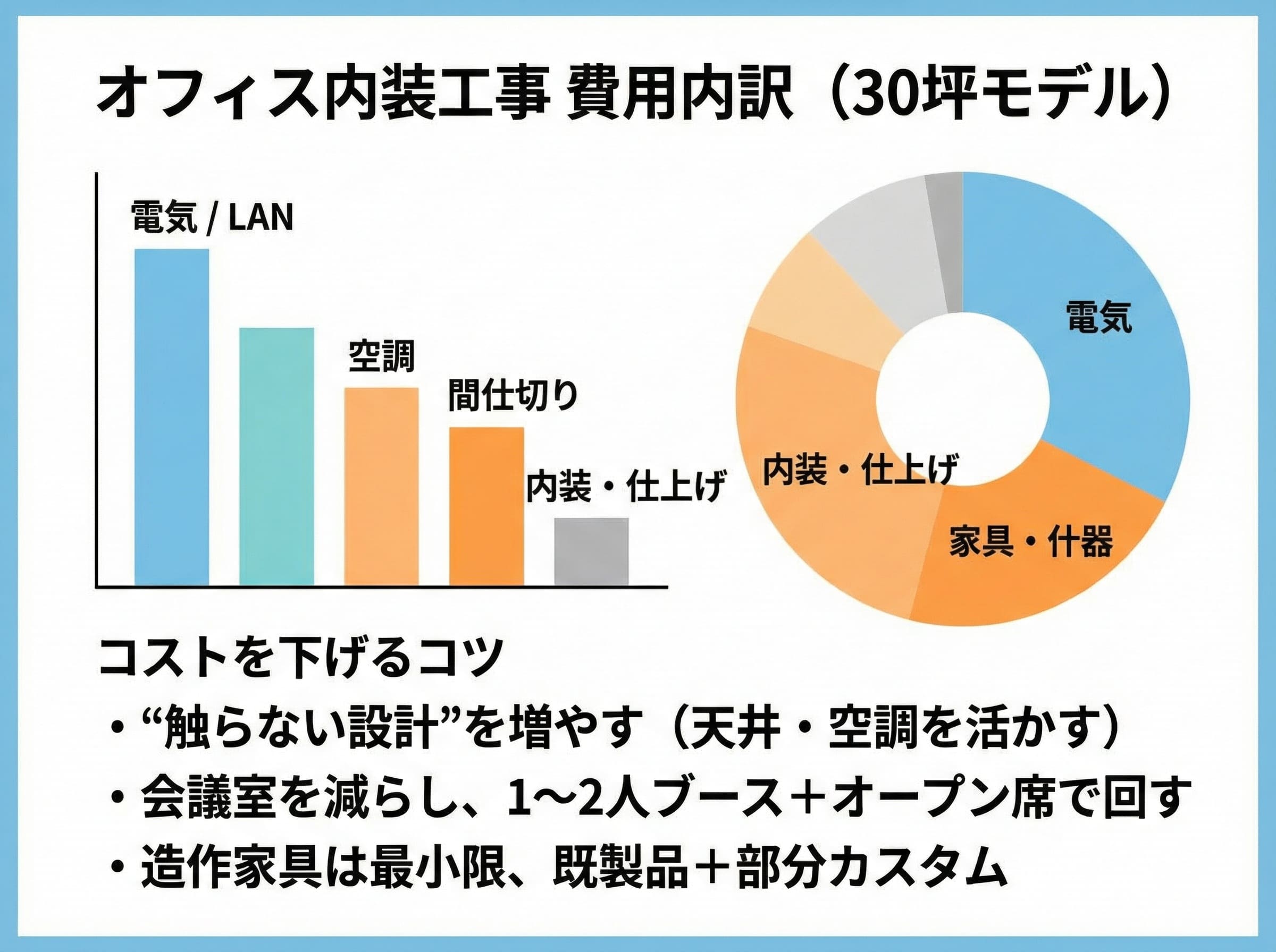 オフィス内装工事は坪単価で語られがちですが、実務では設備(電気・LAN・空調)と間仕切り量で大きくブレます。