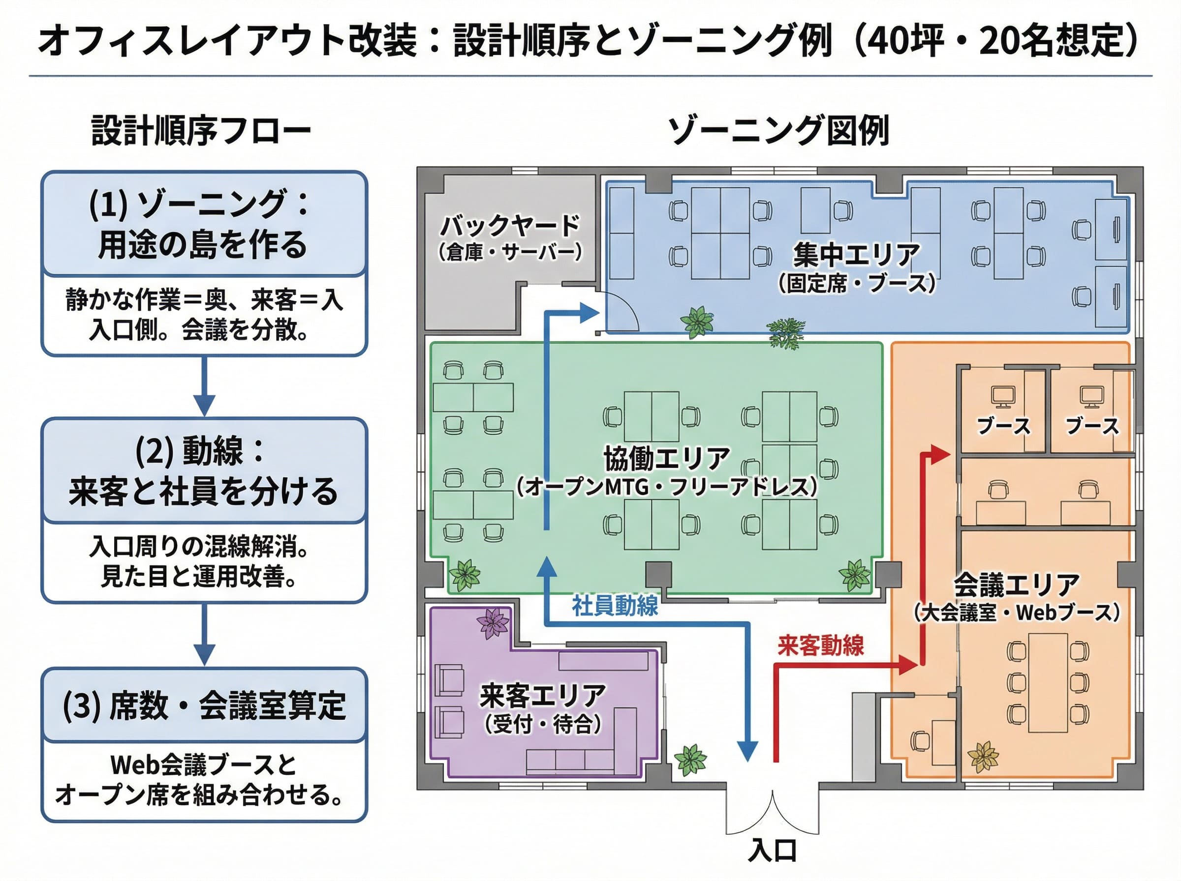 床を4〜6ブロックに分けます(例:集中/協働/会議/来客/バックヤード)。基本は静かな作業=奥、来客=入口側。