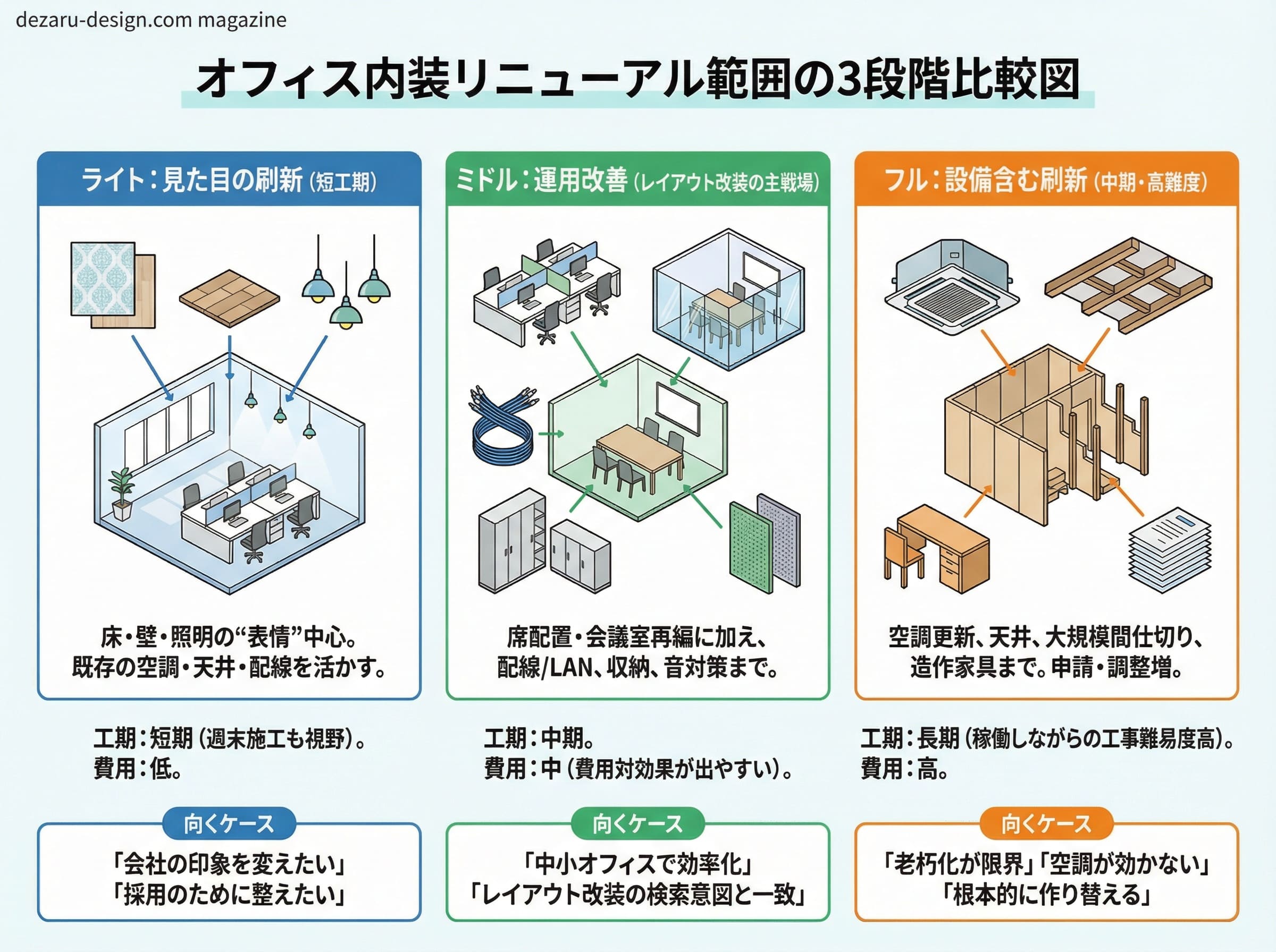 反対に、手狭・増員確定・契約更新が不利なら、移転も含めて比較検討したほうがトータルで安くなることがあります(内装だけで解こうとしないのがコツ)。