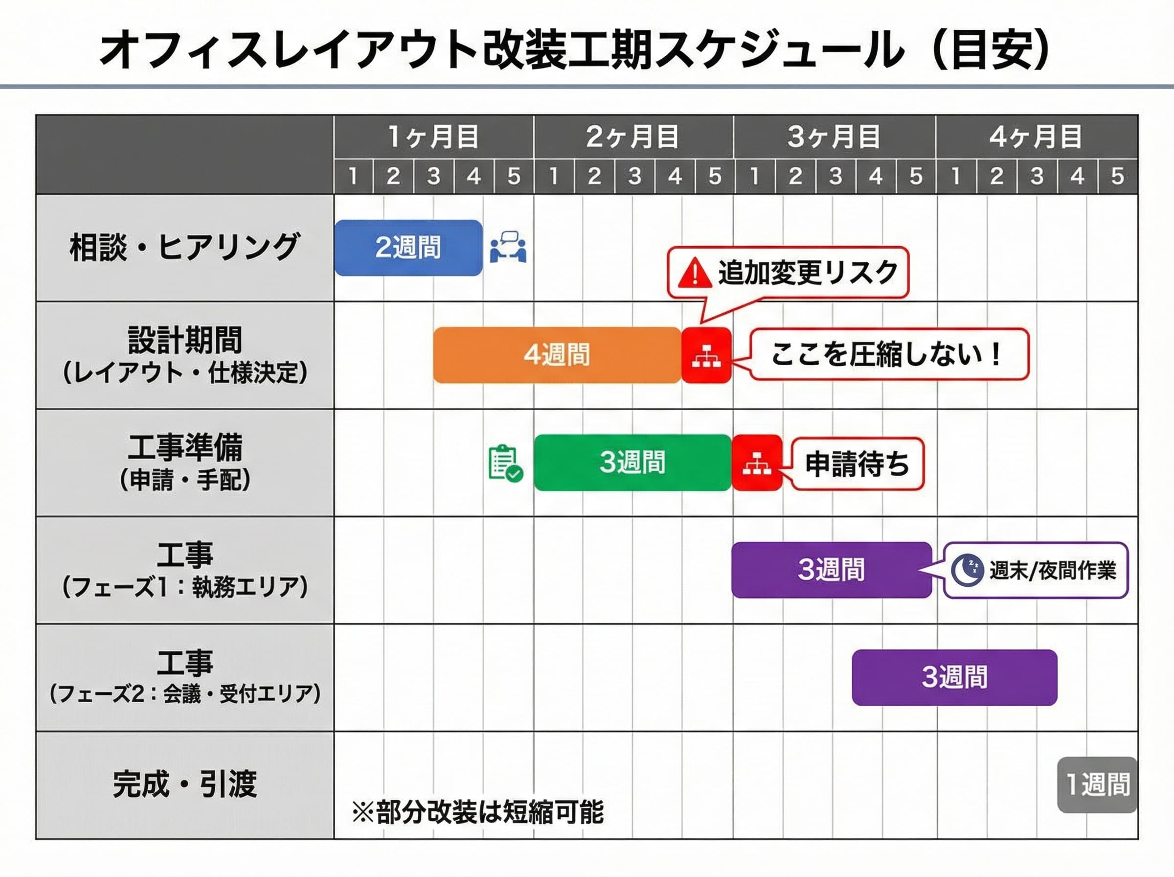 目安としては「相談〜完成:3〜4ヶ月」(部分改装なら短縮可能)で考えると安全です。