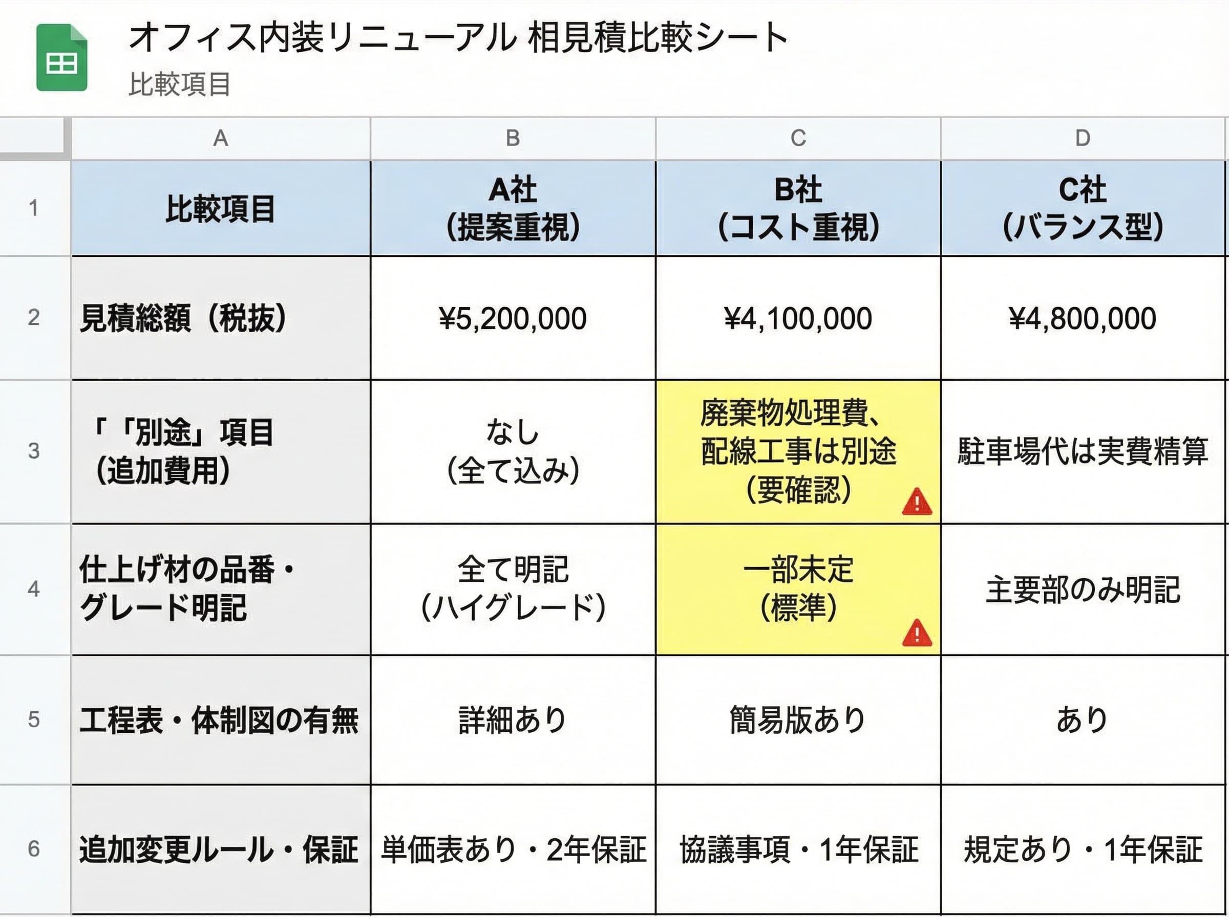 同じ条件で複数社に依頼しないと、金額差の理由が比較できません。中小オフィスほど“担当者の判断”が金額に出るため、依頼条件の揃え方が重要です。