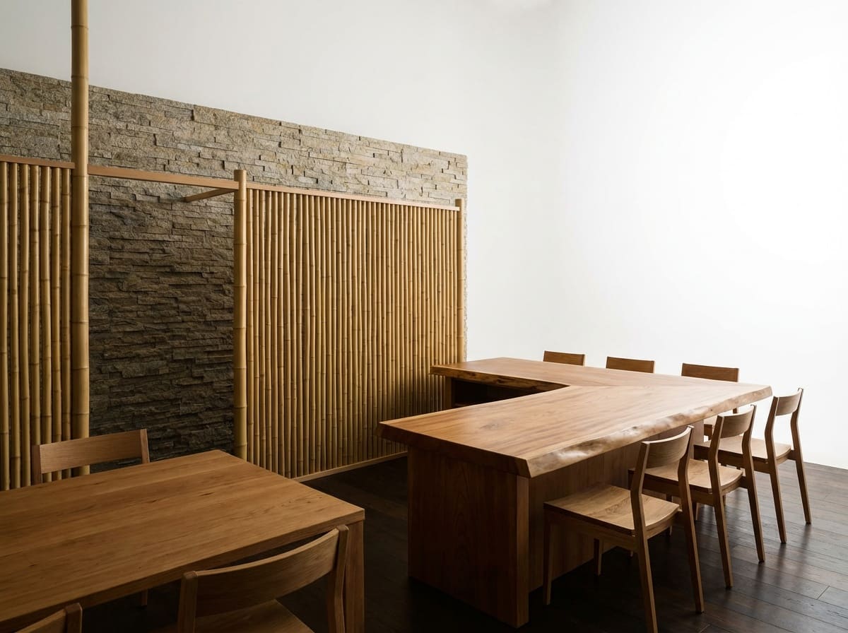 また、竹材は細く柔軟でありながら耐久性があり、壁面のアクセントや照明器具、パーテーションとしても効果的に使用されます。