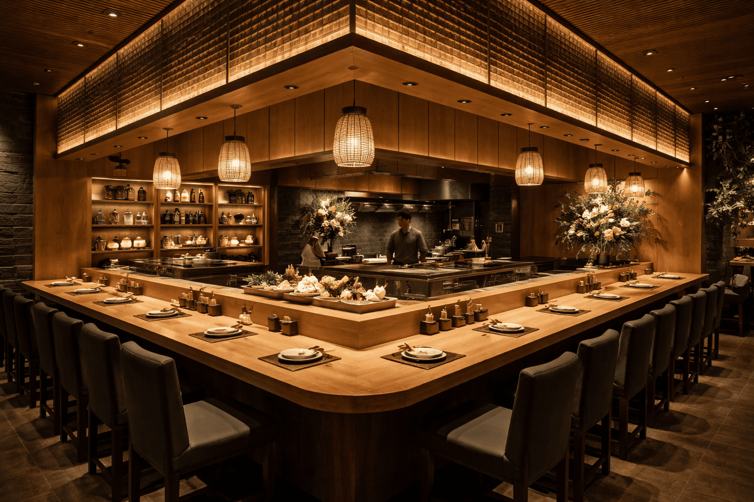 例えば、カウンター席には温かみのある暖色系のスポットライトを設置し、料理やお酒を美味しく引き立てる演出をすると良いでしょう。