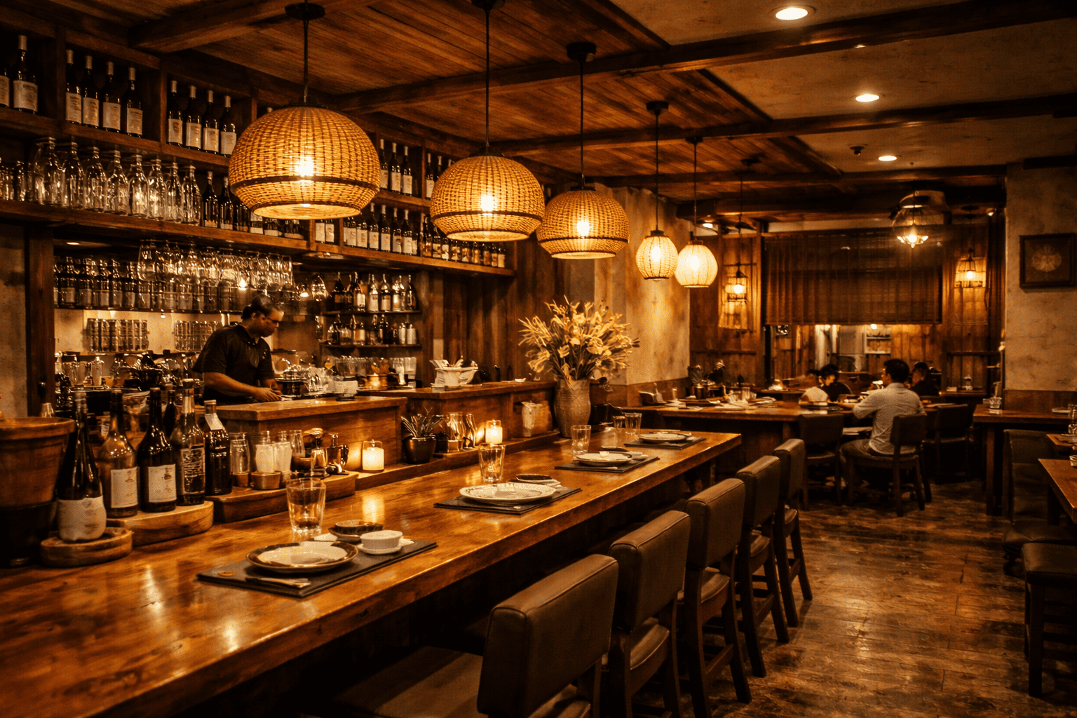 小さな居酒屋では、照明の選び方や配置方法によって、実際より広く感じさせることが可能です。