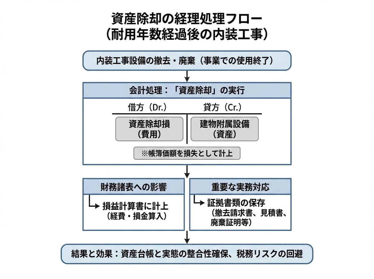 資産除却とは、資産が事業活動で使用されなくなったことを会計上明確にする処理です。