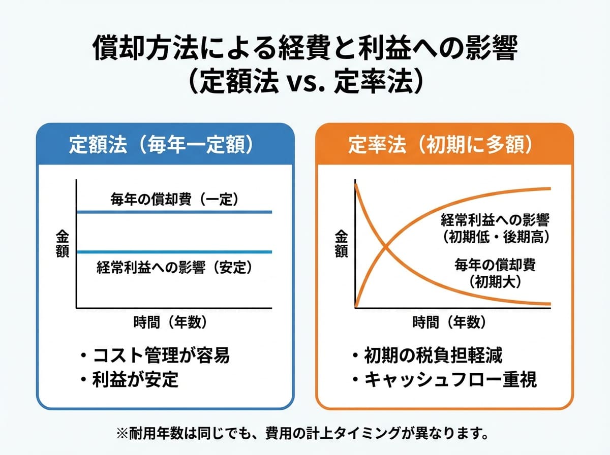 耐用年数そのものが変化することはありませんが、償却方法の違いによって費用計上額や利益計算への影響が大きく異なります。