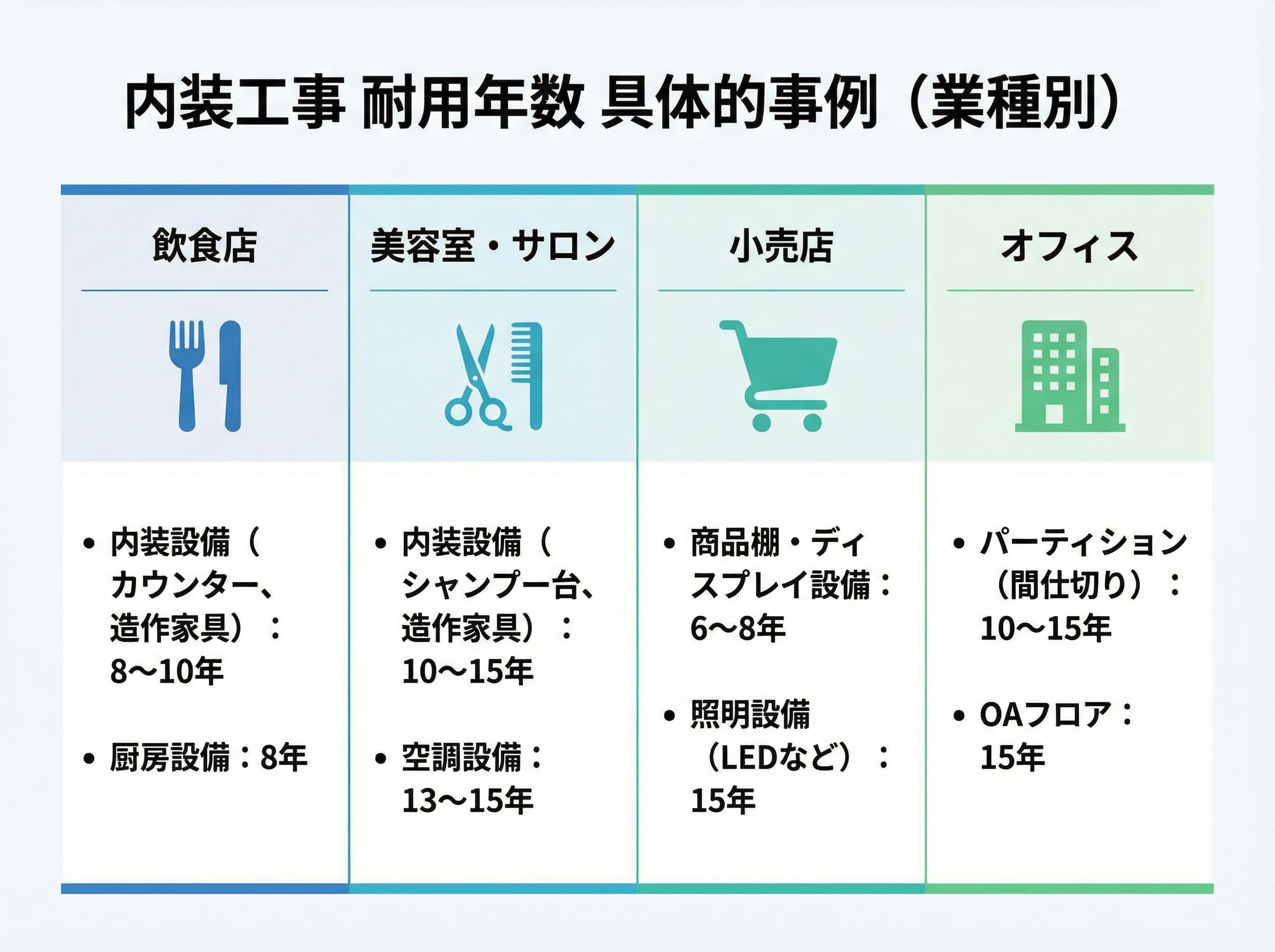 内装設備(シャンプー台、造作家具):10〜15年